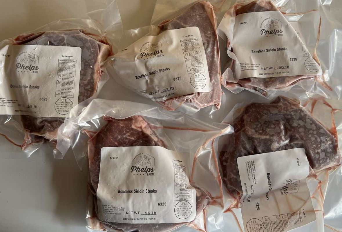 All beef is 21 day dry aged certified black angus. All beef products are frozen. Sirloin steaks are approximately 1/2 lb. packages.