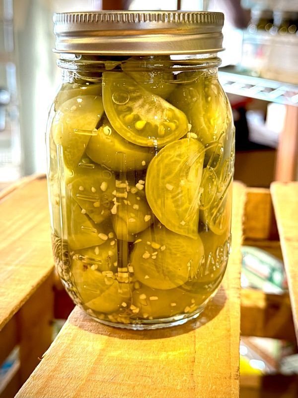 Made fresh with our own farm grown ingredients! Ingredients: Vinegar, Water, Green Tomatoes, Jalapeño Peppers, Salt, Dill, Garlic, Onion