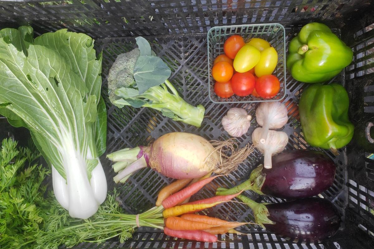 A good mix of seasonal produce great for a single veggie lover or a moderate veggie eating group. Usually includes a greens mix, leafy green, allium, root, and seasonal veg like beans, tomatoes, zucchini etc. Changing every week with the season with more greens in the spring and more heat loving fruit later in the summer.