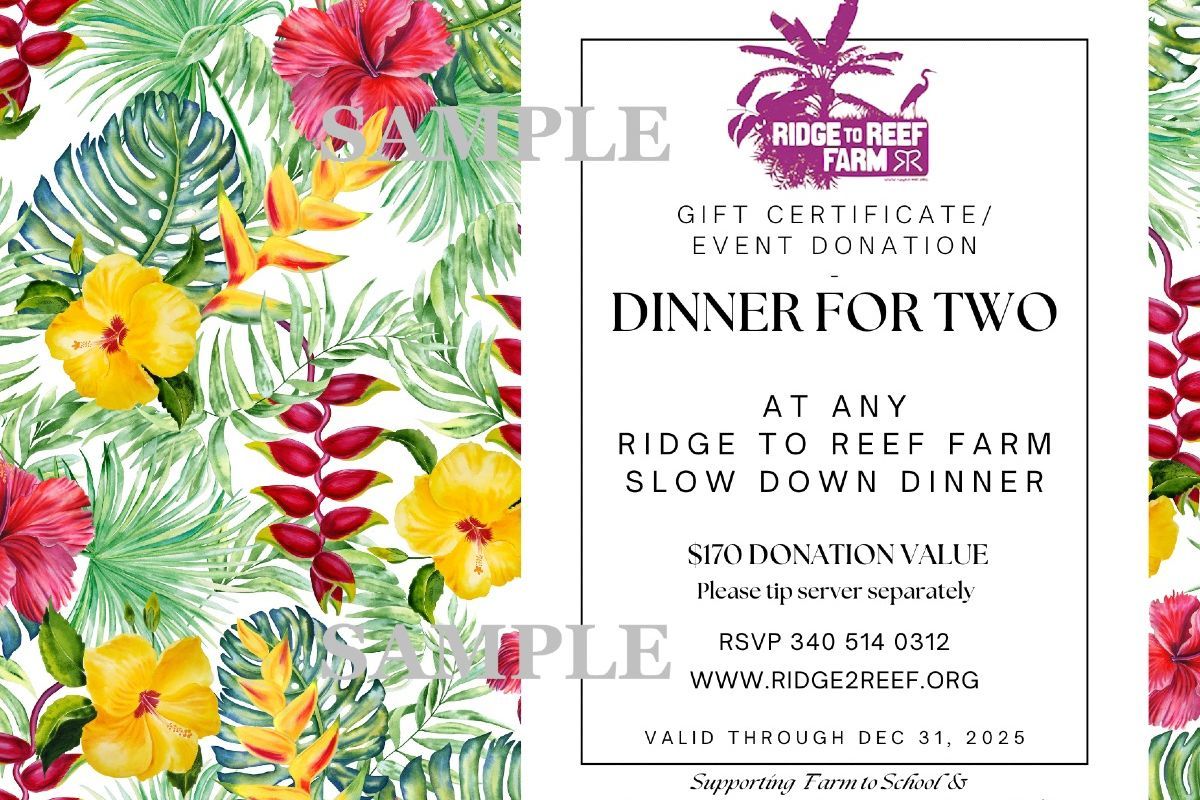 RSVP to csa@ridge2reef.org or text 340-514-0312. Dinner dates are announced to our email list monthly. Join the list here: http://www.ridge2reef.org/emailnews.html