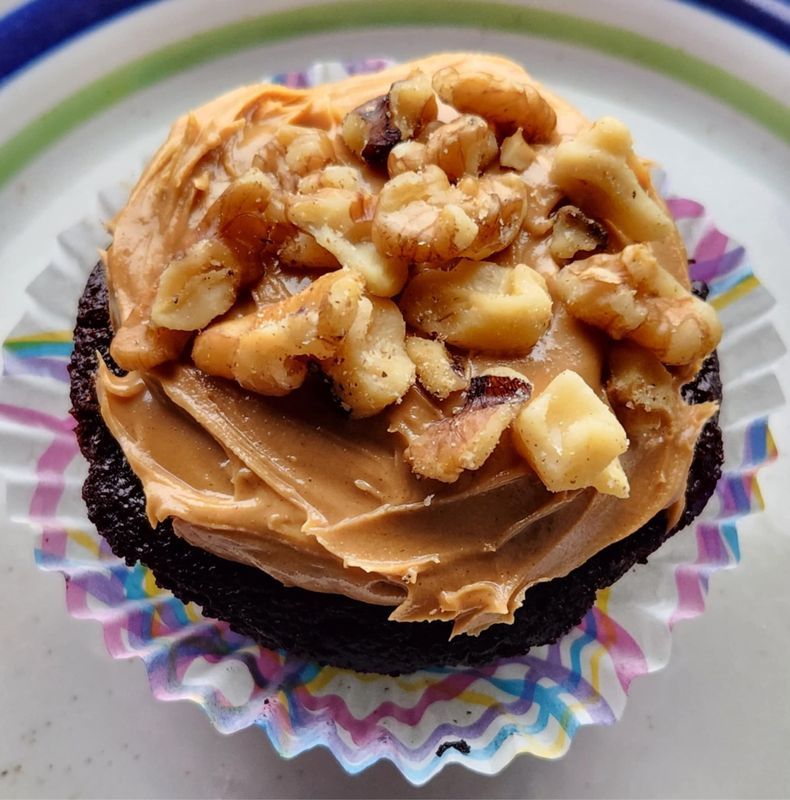 Chocolate cupcakes topped with peanut butter frosting and walnuts 100% vegan 100% delicious