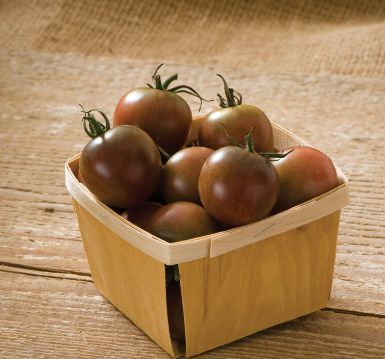 Organic seeds and photo from Johnny's, who describe this as "Sweet and robust... bred in Florida by the late Vince Sapp, the round, 20 gm. fruits are a pleasant purple-brown color. Regarded as one of the best-tasting tomatoes. High yielding. Try as we may, we haven't found a hybrid that can beat Black Cherry." All seedlings are grown using Certified Organic potting mix from Vermont Compost. Seeds are selected because they are heirloom, rare, organic and/or disease resistant varieties.