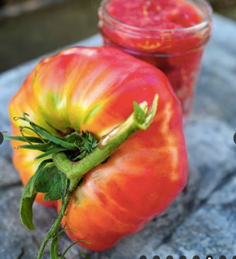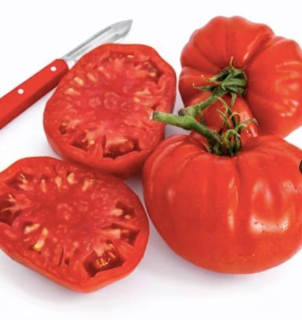 Seeds and photos from Baker Creek, who say: "The classic beefsteak tomato of yesteryear is back! Massive fruit, easily reaching 1 to 2 lbs, has deep red flesh and good old-fashioned tomato flavor. These are the tomatoes that Grandma grew; meaty and firm, perfect on sandwiches or served straight up with a pinch of salt." All seedlings are grown using Certified Organic potting mix from Vermont Compost. Seeds are selected because they are heirloom, rare, organic and/or disease resistant varieties.