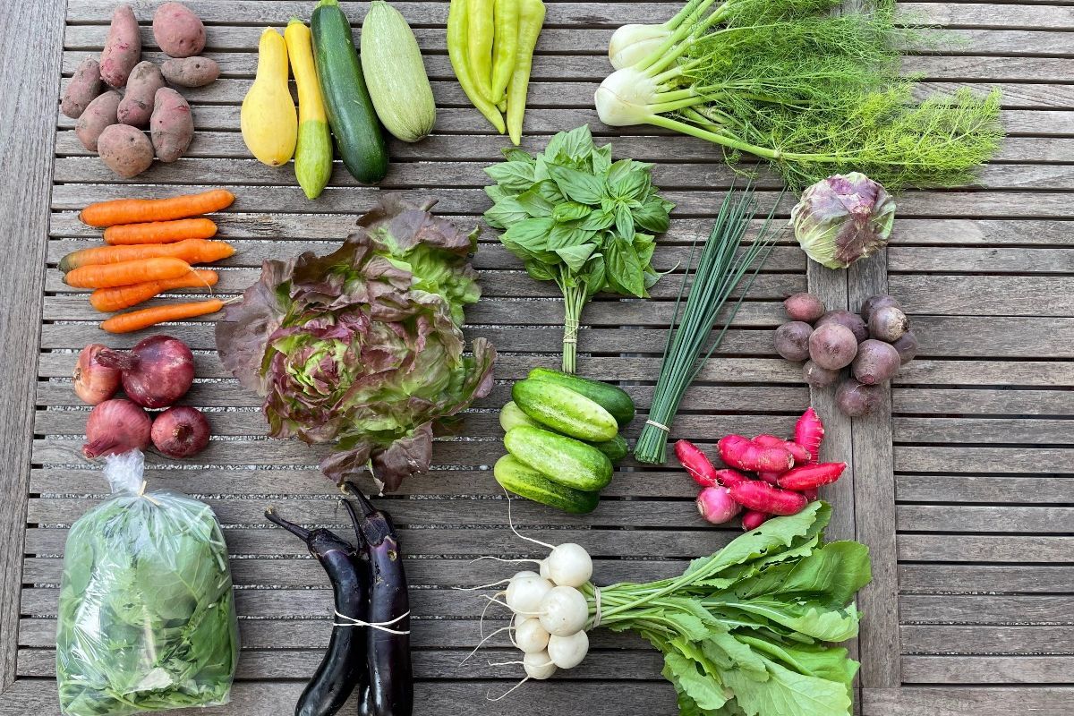 Includes your choice of a variety of salad and cooking greens, root veggies, herbs, and seasonal favorites harvested fresh. Choose the size: Small (6 items per week) for 1-2 people or Full (9 items per week) for 2-4 people. You may purchase multiple if you need more food.