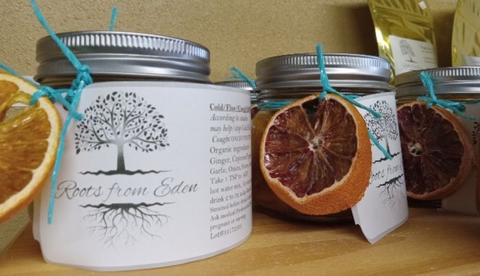 This is an infusion of organic herbs to aid in ridding cough flu and colds. Ingrediats include honey, garlic, onion, grated fresh ginger, Cayenne pepper, lemon, essential oil 1 drop eucalyptus.