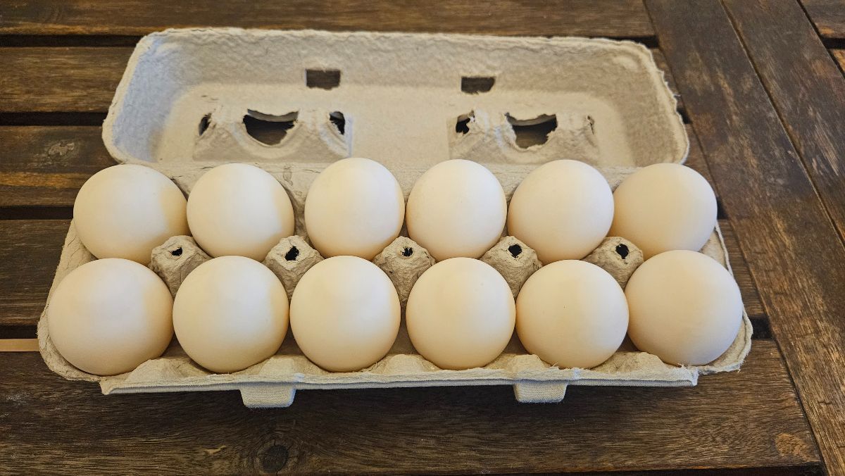 Large, pasture-raised duck eggs from our small flock of Khaki Campbell and Black Swedish ducks. Duck eggs are larger than chicken eggs, with a higher protein & fat content that make them ideal for cooking and baking. 3 duck eggs are the equivalent of about 4 large chicken eggs.