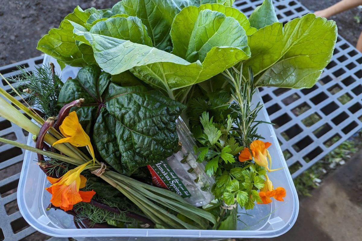 A 5-7 lb box with mix of the Roots: carrots, kohlrabi, reddish, turnips, beets. Herbs/Spices: lemon grass, mint, chili peppers. Greens: lettuce, Tongan spinach, arugula, amaranth, which the farm has in season at the time.