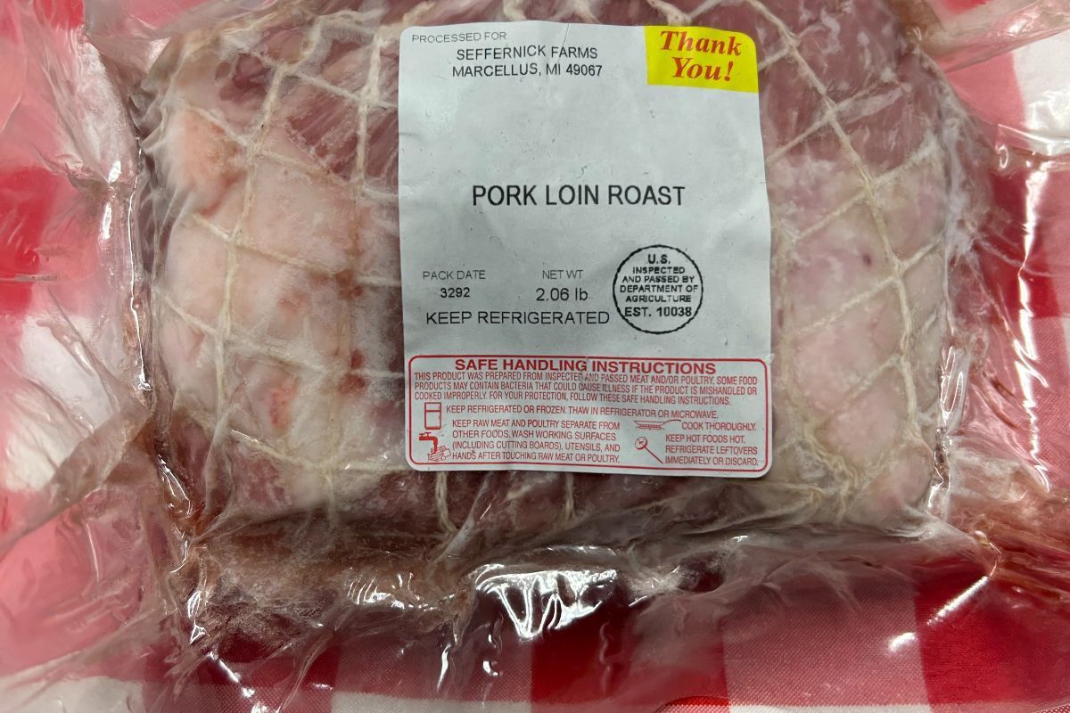 One pork loin roast already wrapped in butchers twine.