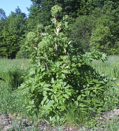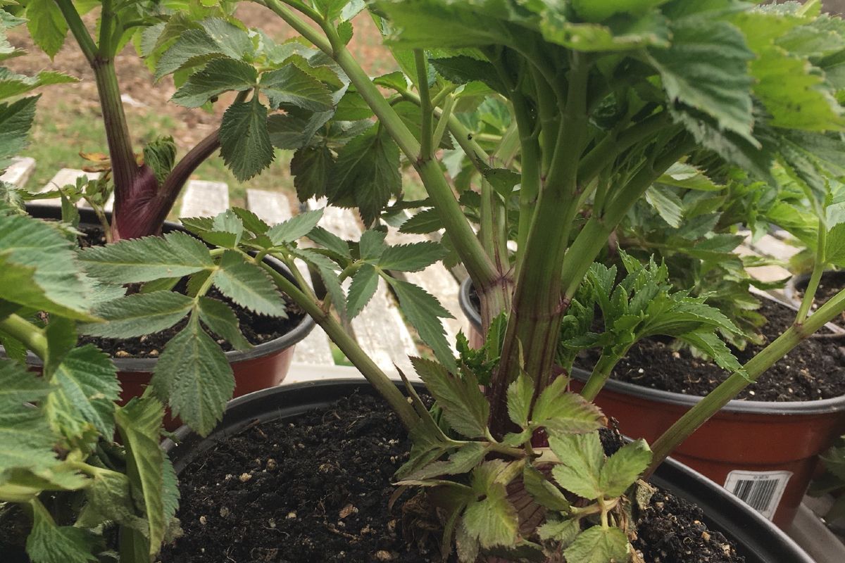 Spring-dug Angelica plant in a pot. Transplant into your garden in spring or early summer; loves growing in full sun and in wet ground. Grows to 6+ feet tall by late June. Their large, sparkling, starburst flowers are pollinated by a great variety of beneficial insects. Anise-flavored young stalks emerge in May and can be used like celery. More info at our farm's Perennials page at https://snakeroot.net/farm/planting-perennials/