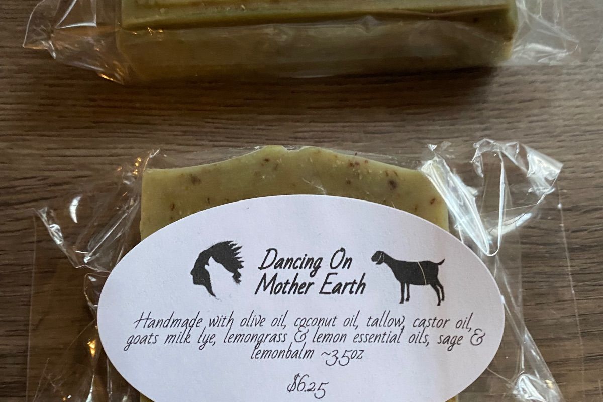 Handmade soap made with coconut olive and castor oil, lard goats milk, sodium hydroxide Lemon balm and sage, herbs, and lemongrass and lemon essential oils.