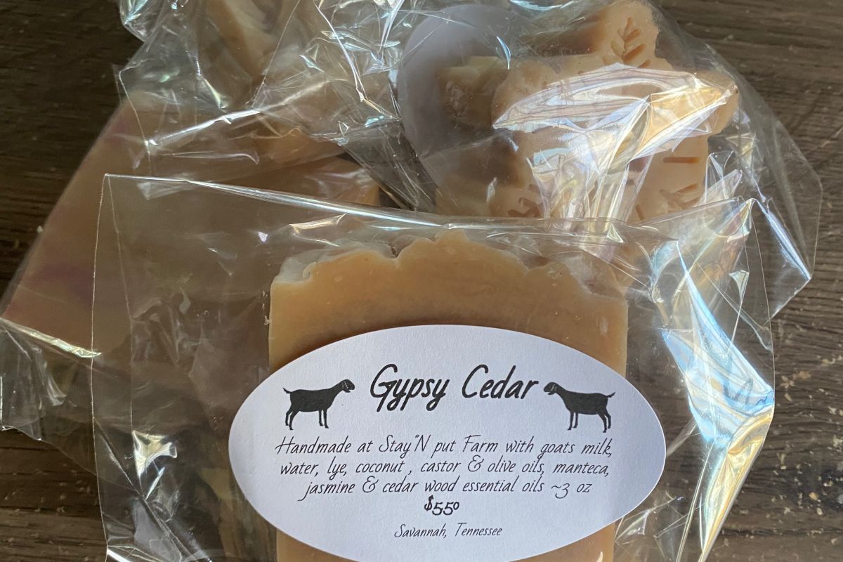 Handmade Soap, using olive, coconut, and castor oil, lard, goats milk Sodium hydroxide and jasmine , cedar wood essential oils.