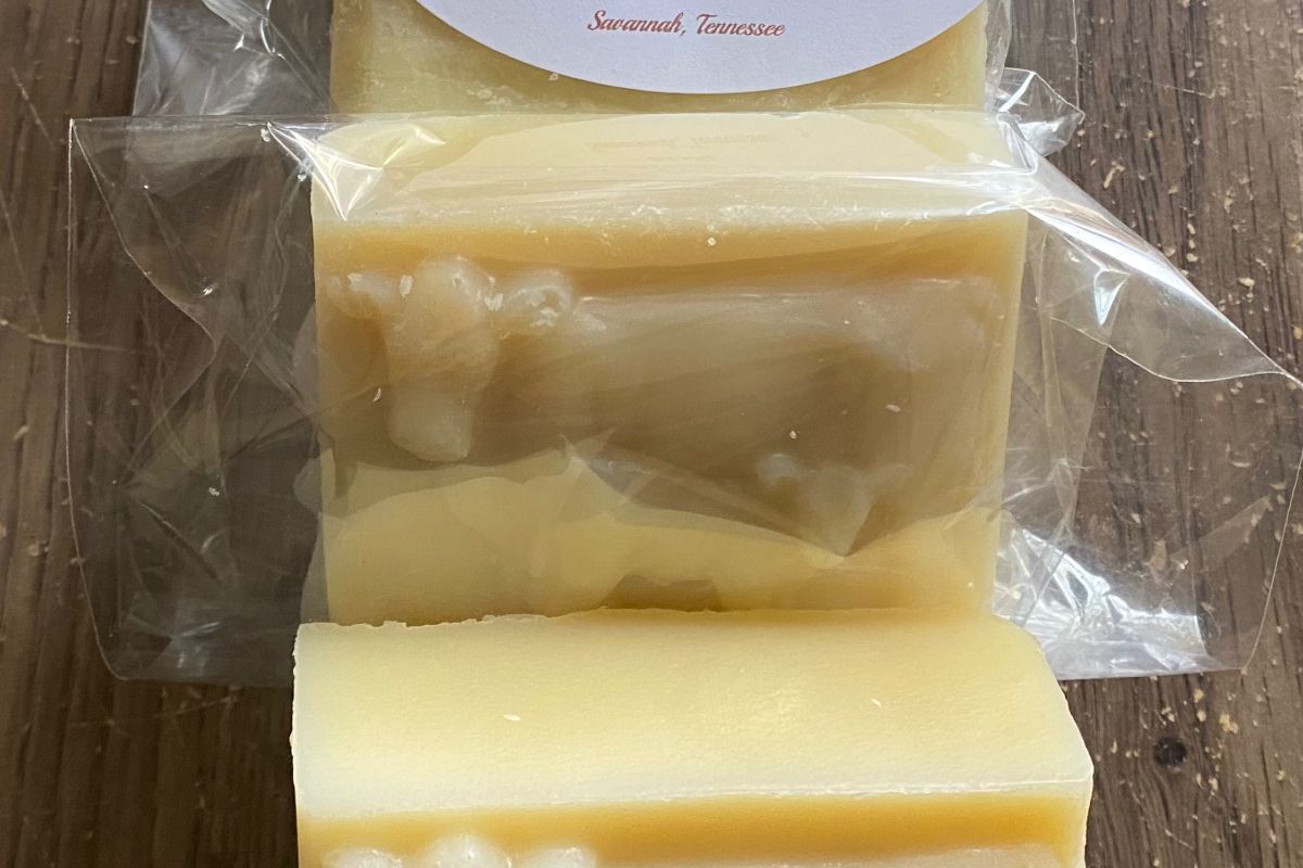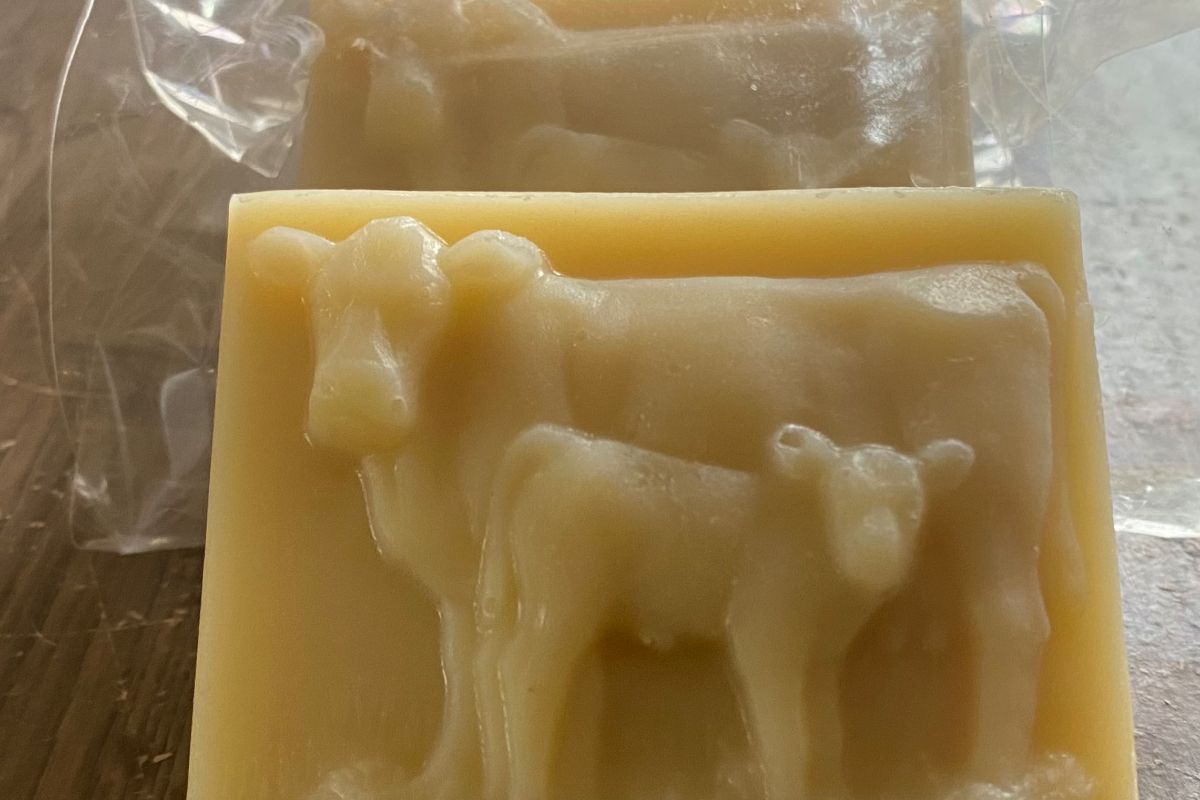 Hand soap from olive coconut, castor oils, lard, sodium hydroxide, Dexter cow yogurt, shea butter, bergamot and lavender essential oils.