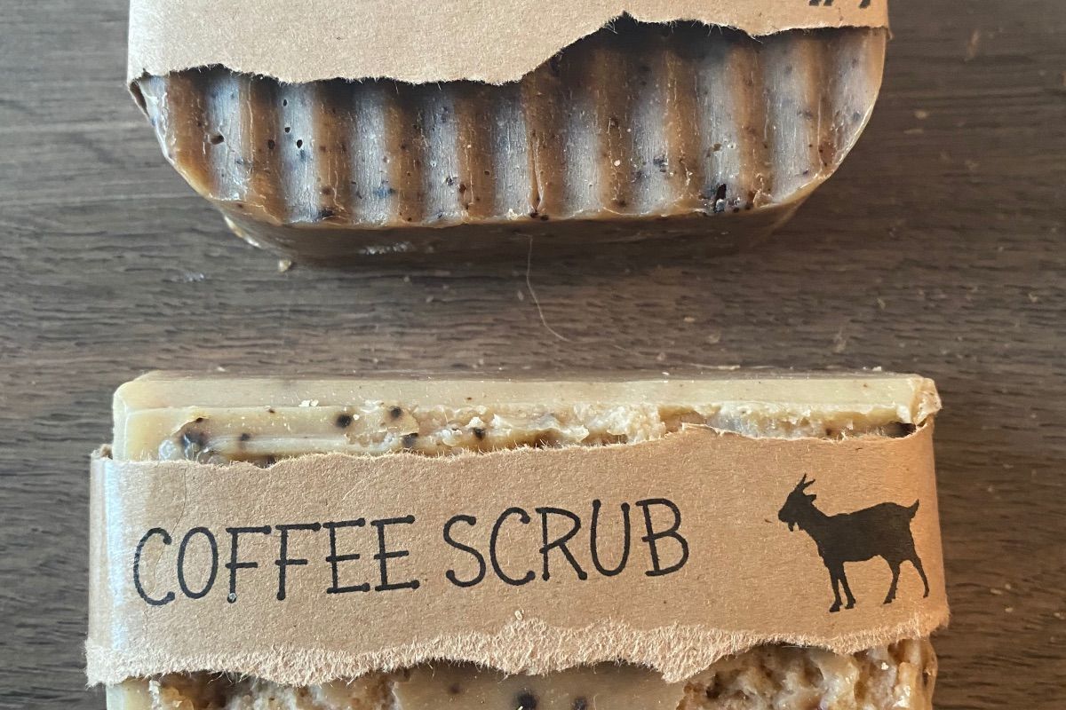 Hand soap using Olive coconut and castor oil, lard, goats, milk, sodium hydroxide, Coffee grounds, vanilla and patchouly essential oils