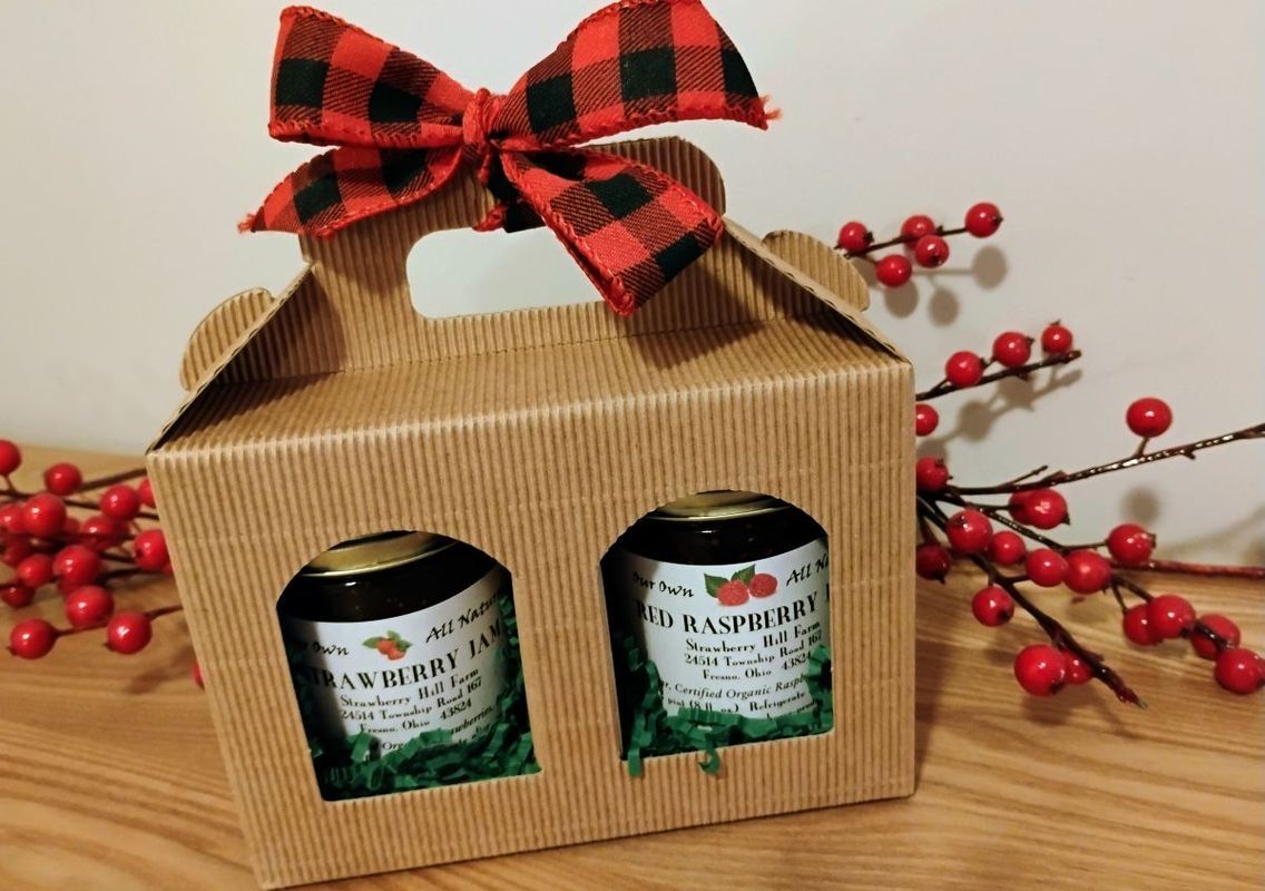 Holiday gift box of our own strawberry and red raspberry jam, made with organic berries
