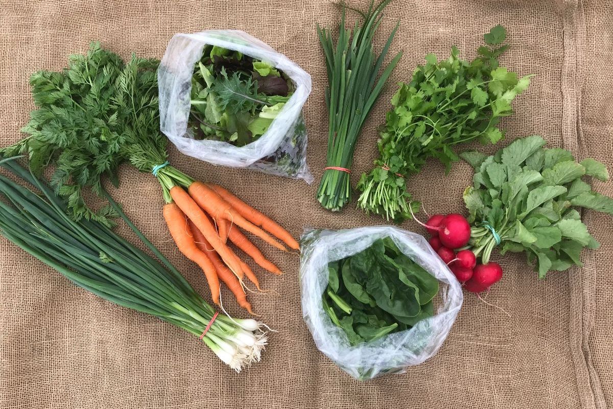 Our Small Summer Share contains 5-7 items and is adequate for 2-4 people. This share runs for 20 weeks. Expect lots of greens (salad, spinach, etc) and roots (carrots, radishes, etc) in the early months, a diverse box in the summer (with tomatoes, cucumbers, and so many more), and more fall crops (cauliflower, broccoli, garlic, onions, etc) later on. Our produce is certified Real Organic! Eggs will be available to add on a weekly basis as available.