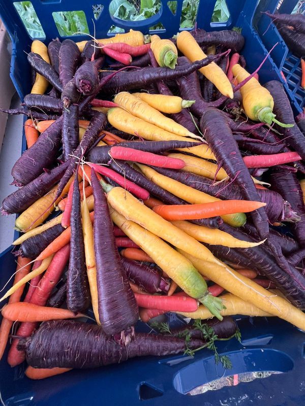 3. A crate of carrots of at least three different varieties.