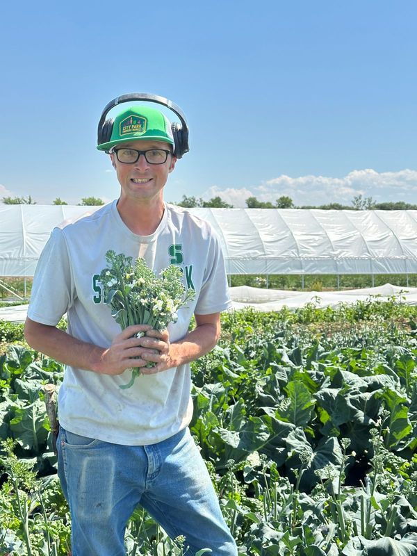 1. Brett in the field holding a bunch of broccolini like a bouquet.