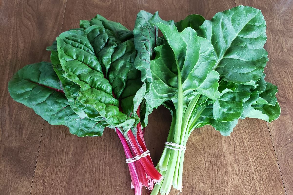 A bunch of mature Swiss chard leaves, which have a sweet but earthy taste reminiscent of its cousin, the beet. These are perfect as cooking greens! Two varieties are available: Ruby (red) and Verde da Taglio (green).