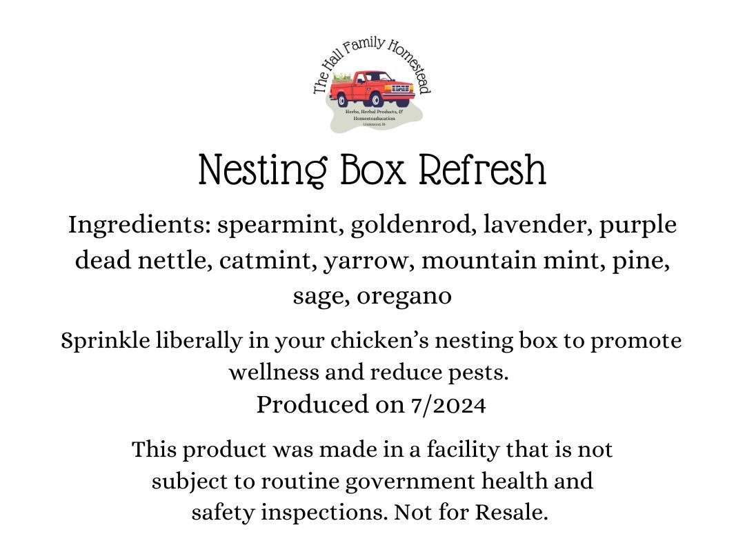Our nesting box herbs vary based on what is harvested and what is crafted each week. All herbs are critter-safe and promote wellness amongst your flock.