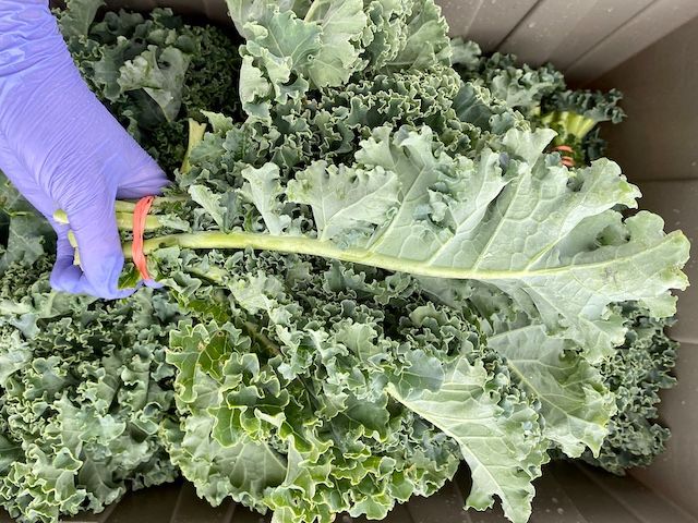 1 bunch of Green curly leaf kale. Green, curled leaves in this classic kale variety. Be sure to de-stem these before using; great for cooked dishes, kale chips, and can even be eaten raw if massaged vigorously with salt and EVOO in order to tenderize.