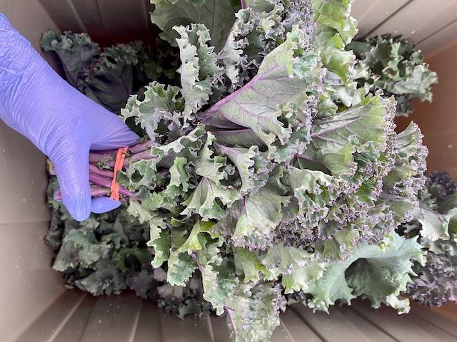 1 bunch of scarlet kale. Beautiful purple and green frilly leaves are loaded with anthocyanins to aid in brain and heart health! Be sure to de-stem these before using; great for cooked dishes, kale chips, and can even be eaten raw if massaged vigorously with salt and EVOO in order to tenderize.