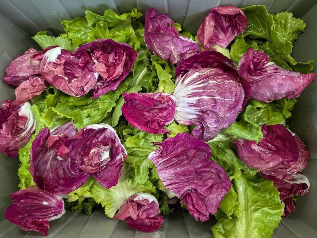 A bag of loose leaf chicories including broadleaf escarole, frisée, and radicchio. Great used in soups or salads! We also recommend combining these greens with other leafy greens including kale, chard, collards and more for a particulary delicious braising greens mix. Bags average about 1/4#.