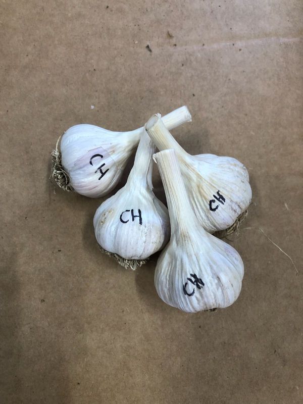 Originally from Shvelisi in the Republic of Georgia, this outstanding garlic is perhaps the most consistent of any of the Purple Striped. It is easily one of the most colorful garlic varieties we offer as well. It yields heavy, tightly wrapped striped heads whose 6 to 10 easy to peel cloves have cranberry tinted skins. Chesnok Red has a well-balanced flavor for eating raw, and when cooked it becomes gentle, earthy and rich with smooth sweetness and just a touch of heat. Wonderful roasted. Label on bulbs: CH