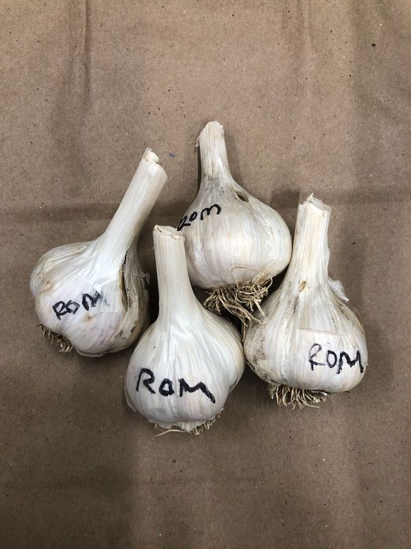 Romanian Red cloves are streaked and lined on a buff brown background. Very good storage. Usually 4 to 5 cloves per bulb. Hot and pungent with a healthy, long lasting bite. Label on bulbs: ROM