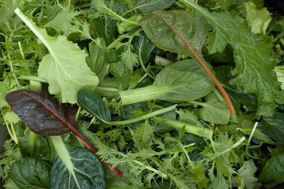 A bag of mixed greens including spinach, tokyo bekana, mustard greens, mizuna, tatsoi, and more. Bags average about 1/3#. Also great used in soups or salads!