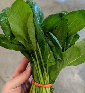 Bunch of Komatsuna, a versatile leafy green. Komatsuna has a fresh, sweet taste and a crunchy texture. It can be eaten raw, stir-fried, boiled, used fresh in salads, pickled, or added to soups. It is popular in soups as it can stay firm after being simmered. It is an excellent source of calcium, vitamin A, and vitamin C.