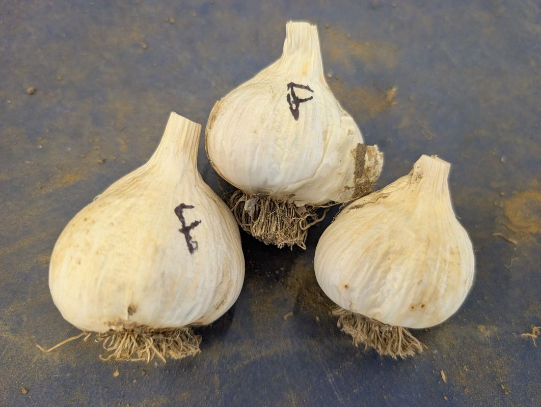 French is a softneck and will not produce a scape. The clove wrappers range from pink to solid pink-brown. Most often grows with 12 to 16 cloves per head. Excellent flavor. While milder than other Silverskin strains, this variety of garlic offers a bold flavor that has greater heat the further north from its native Texas that it is grown! French is a very long storing silverskin garlic - it can keep up to a year. Label on bulbs: F