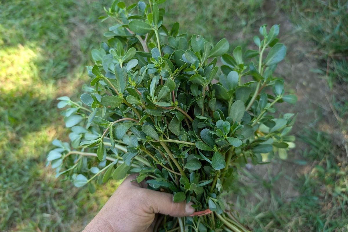 Purslane is a green, leafy vegetable that can be eaten raw or cooked. This succulent plant contains about 93% water. It has red stems and small, green leaves. It has a slightly sour or salty taste, similar to spinach and watercress. It can be used in many of the same ways as spinach and lettuce, such as in salads or sandwiches.
