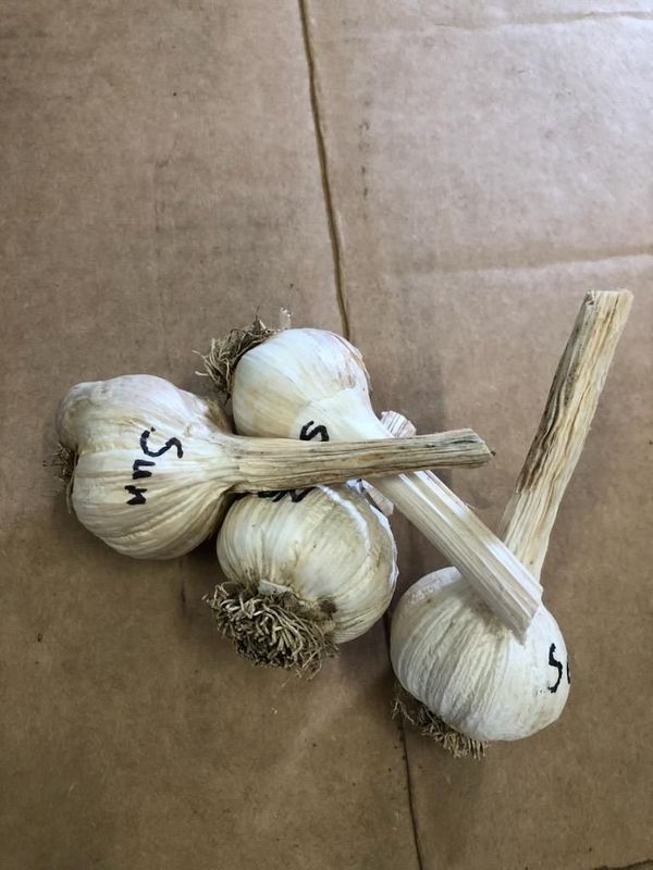 We believe Sunset garlic is in the Creole family because of the plant habit and flavor. We originally got the seed stock from some people in the Navy who had brought it back from Italy. The farmer they got it from just called it "my garlic." The sailors named it Sunset because of the beautiful color of the clove wrappers. It has a distinctly peppery flavor and is different from any other variety we grow. Smaller heads and cloves, but worth it. Label on bulbs SUN