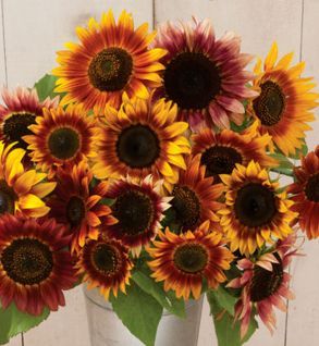 Annual. Autumn Beauty Sunflower mix. These bold, beautiful flowers can grow up to 6 feet tall and to 8 inches across. Flowers have branching stems with bright yellow, bronze, and purple shades. They bear pollen and are good for bee forage. Transplant plugs 18-24" apart. Harden off and plant outside when temperatures are consistently above 50 degrees.