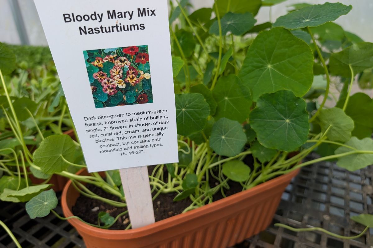 Bloody Mary Mix Nasturtium plants in a round bowl planter.