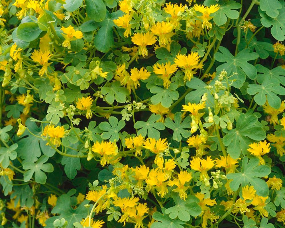 You can let Canary Creeper spread over the ground on its own, ramble up a trellis, or scramble over shrubs and around other plants. It owes its common name to its showy yellow flowers with deeply fringed petals that resemble the wings of a canary in flight. Prefers warm, dry conditions. Grows up to 8-12ft.