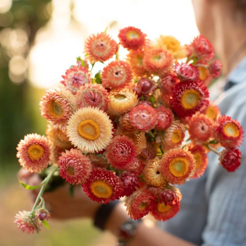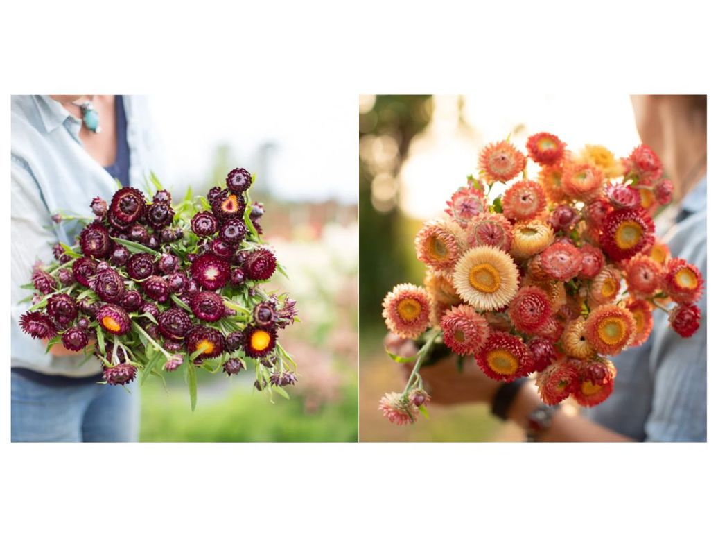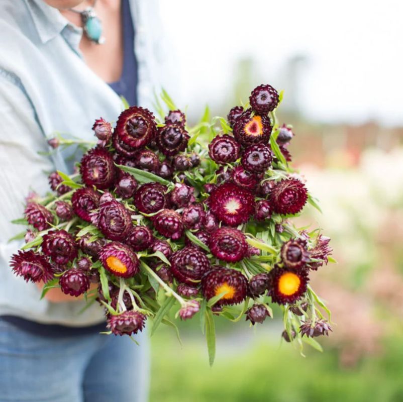 This warm mix of pretty peach-and-apricot + deep rich wine-colored double flowers ride atop long, strong stems. Also known as everlasting flowers, the color and shape of these papery blooms will last indefinitely when dried. Pollinators love them.
