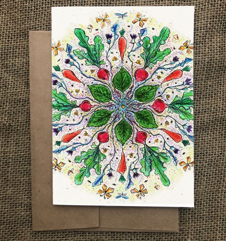 5" x 7" Greeting card print of a colorful ink, watercolor, and color pencil illustration by Lauren of various vegetables, flowers, and bugs including carrot, spinach, beets, and thistles arranged in a circle with a repeating ornamental pattern. Envelope included.