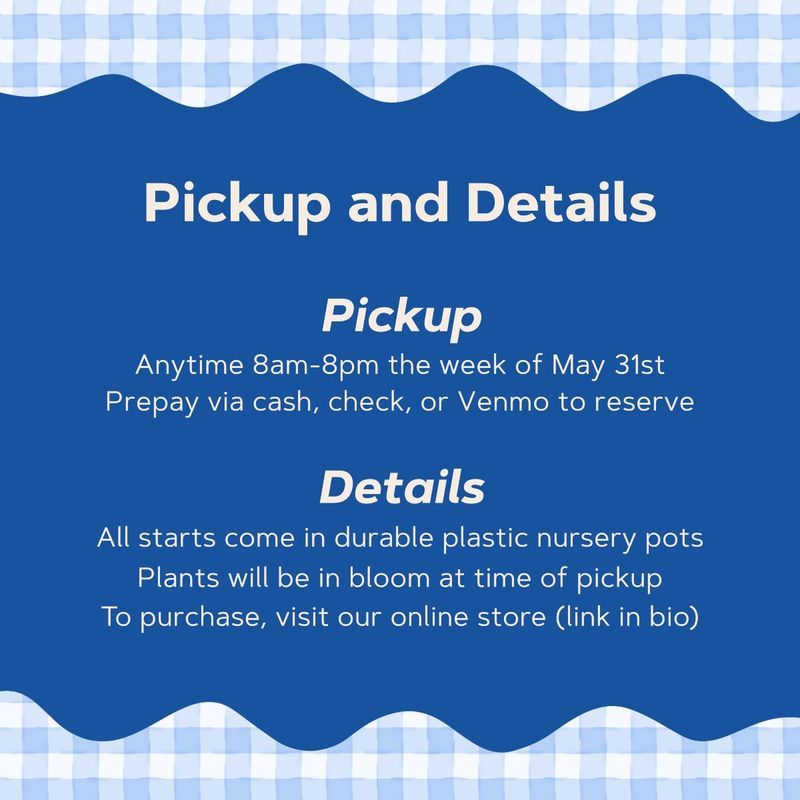 All starts come in durable, reusable plastic nursery pots. Plants will be in bloom at the time of pickup and they bloom all season long. Pickup anytime the week of May 31st 8am-8pm. We only use organic potting soil and fertility inputs. You are guaranteed all healthy plant(s).