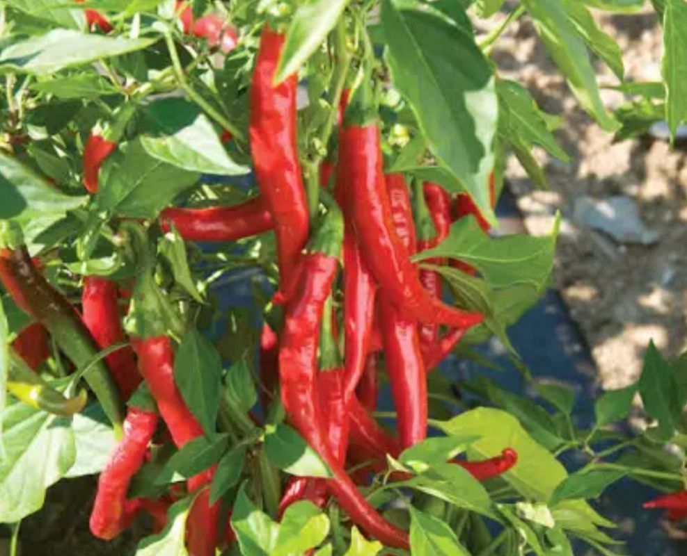 Cayenne pepper plants produce long thin very hot peppers that are usually picked red. They can be used fresh or dried. 24-36 inches tall , productive plant. Full Sun, good garden soil.