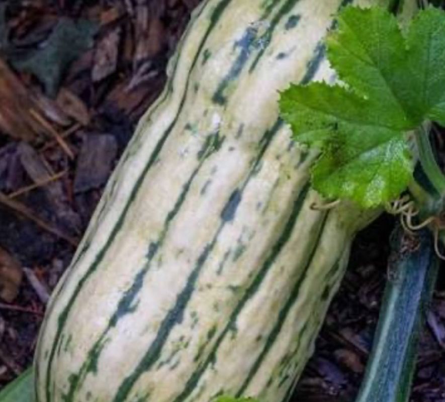 Delicata is a productive fall squash plant. 6-8 inch tan with green and orange striped oblong squash with sweet and tasty orangey flesh with thin skin; harvest in the Fall. Plant 2 feet apart, in full sun. Needs good organic soil and consistent water.