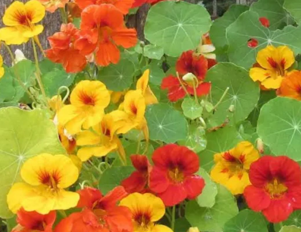 Jewel is 18-36 inch vining nasturtium with green leaves and red, yellow, or orange flowers. Will trail or can be trained on a trellis. Spicy edible flowers and leaves for salads.