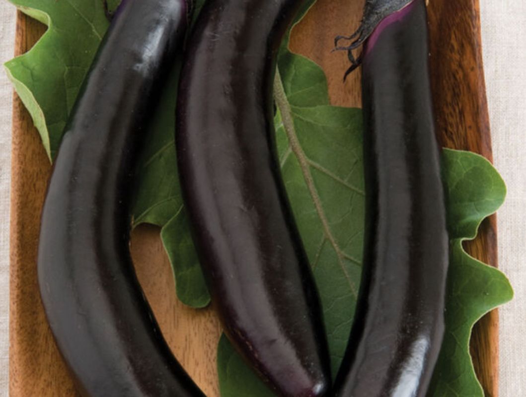 “Orient Express” eggplant are a classic Asian eggplant. 8-12 inch, long thin, tender fruits are great for curry, roasting, ratatouille, and more. 2-3 foot plant. Full sun.