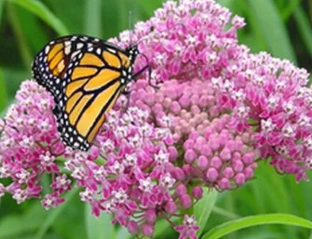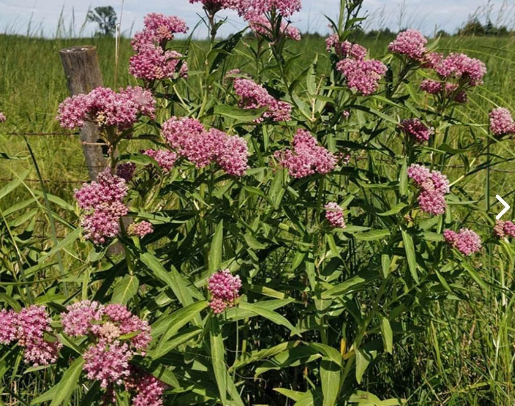 Asclepias incarnata. 1.5-2 feet tall perennial, narrow leaves, great in wet areas. These showy, pink flowers give off a sweet scent similar to cinnamon or vanilla. Attractive to butterflies, this variety flourishes in swamps or along streams, so it is a great option for a butterfly plant in a wet setting. Swamp milkweed plants are a staple of many wetland plantings.