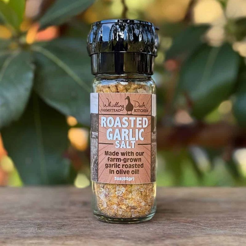 Whistling Duck Farm Roasted Garlic Salt is made with our own farm-grown garlic and organic extra-virgin olive oil. The perfect pairing to complete a meal.