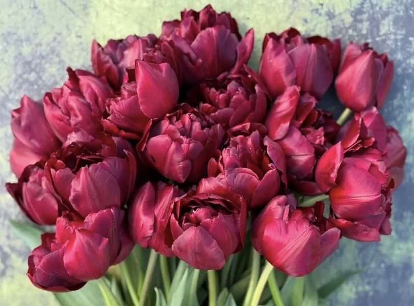 Double, dark burgundy flowers. Gorgeously moody. Stem Length: ~18"+ Photo Credit: Onings America