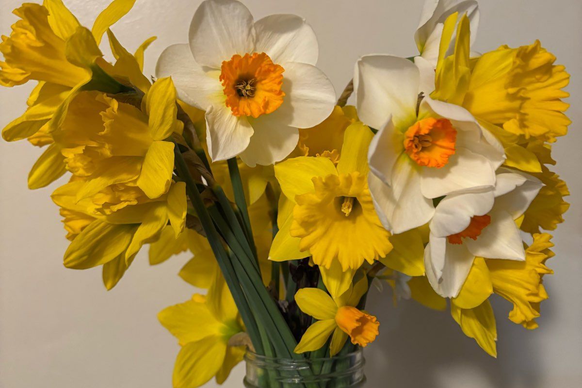 One bunch of 10 mixed trumpet-style daffodils picked at the gooseneck stage, about 12 to 14 inches in length. Last photo shows what varieties you may receive once they open.
